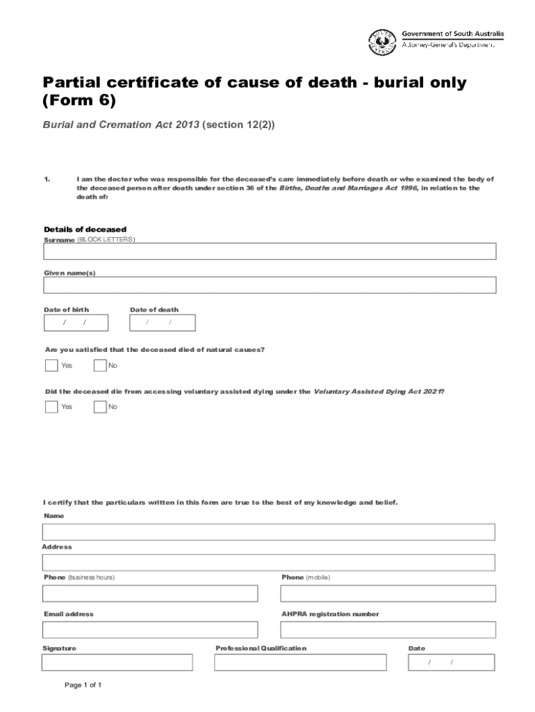 Partial certificate of cause of death burial only (Form 6) Burial and Cremation Act 2013 (section 12(2))I am the doctor who was responsible for the deceased scare immediately before death or who examined