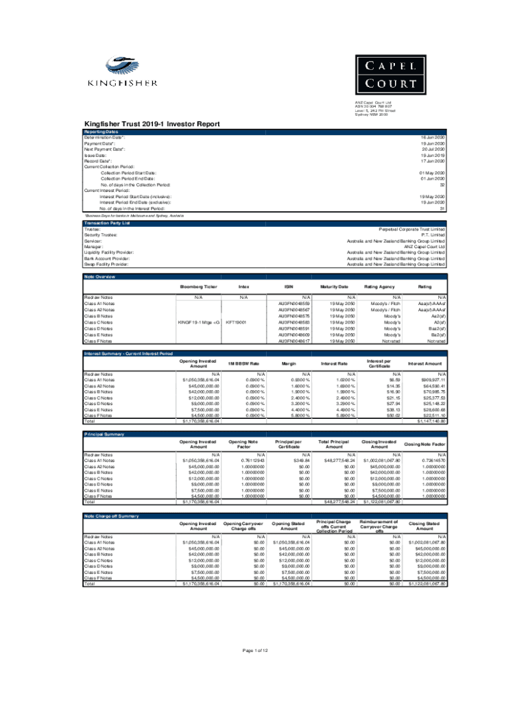 ANZ Chapel Court Ltd ABN 30 004 768 807 Level 5, 242 Pitt Street Sydney NSW 2000Kingfisher Trust 20191 Investor Report Reporting Dates Determination Date*: Payment Date*: Next Payment Date*: Issue