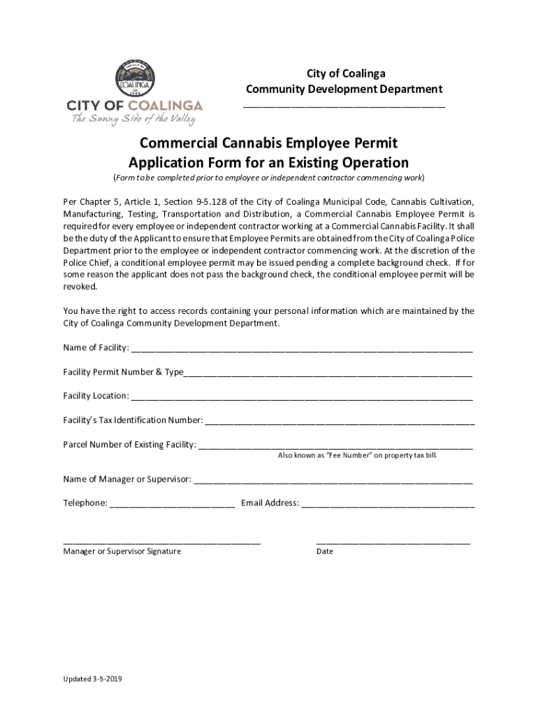 CityofCoalinga CommunityDevelopmentDepartment ___ CommercialCannabisEmployeePermit ApplicationFormforanExistingOperation (Formtobecompletedpriortoemployeeorindependentcontractorcommencingwork) Per