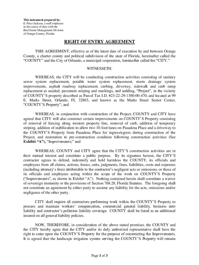 This instrument prepared by: E. Price Jackson, a staff employee in the course of duty with the Real Estate Management Division of Orange County, FloridaRIGHT OF ENTRY AGREEMENT THIS AGREEMENT, effective