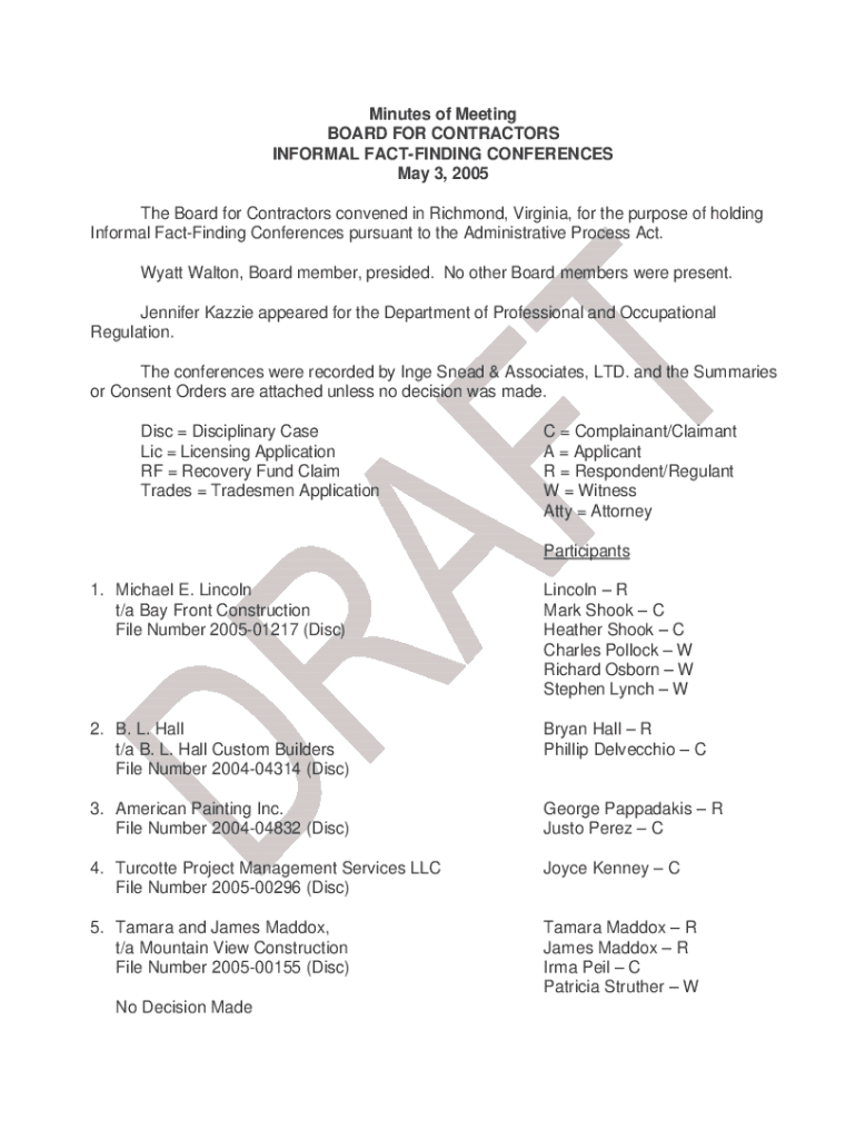 Minutes of Meeting BOARD FOR CONTRACTORS INFORMAL FAULTFINDING CONFERENCES May 3, 2005, The Board for Contractors convened in Richmond, Virginia, for the purpose of holding Informal Faultfinding Conferences
