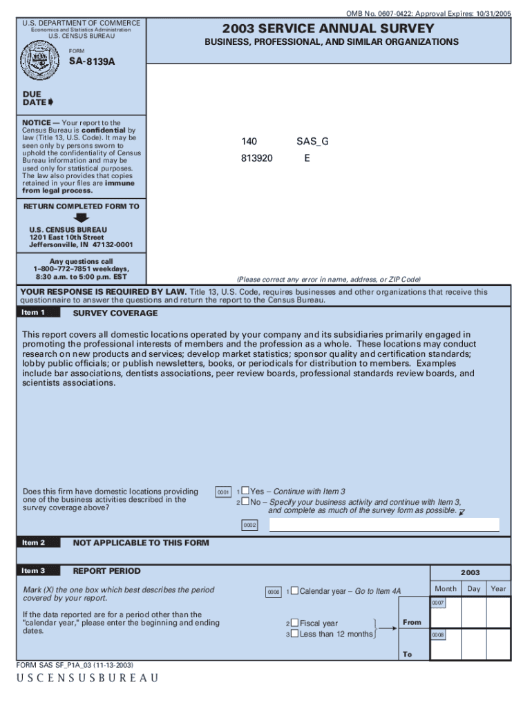 OMB No. 06070422: Approval Expires: 10/31/2005 U.S. DEPARTMENT OF COMMERCE2003 SERVICE ANNUAL SURVEYEconomics and Statistics AdministrationBUSINESS, PROFESSIONAL, AND SIMILAR ORGANIZATIONSFORMSA 8139AREASBUUSCE