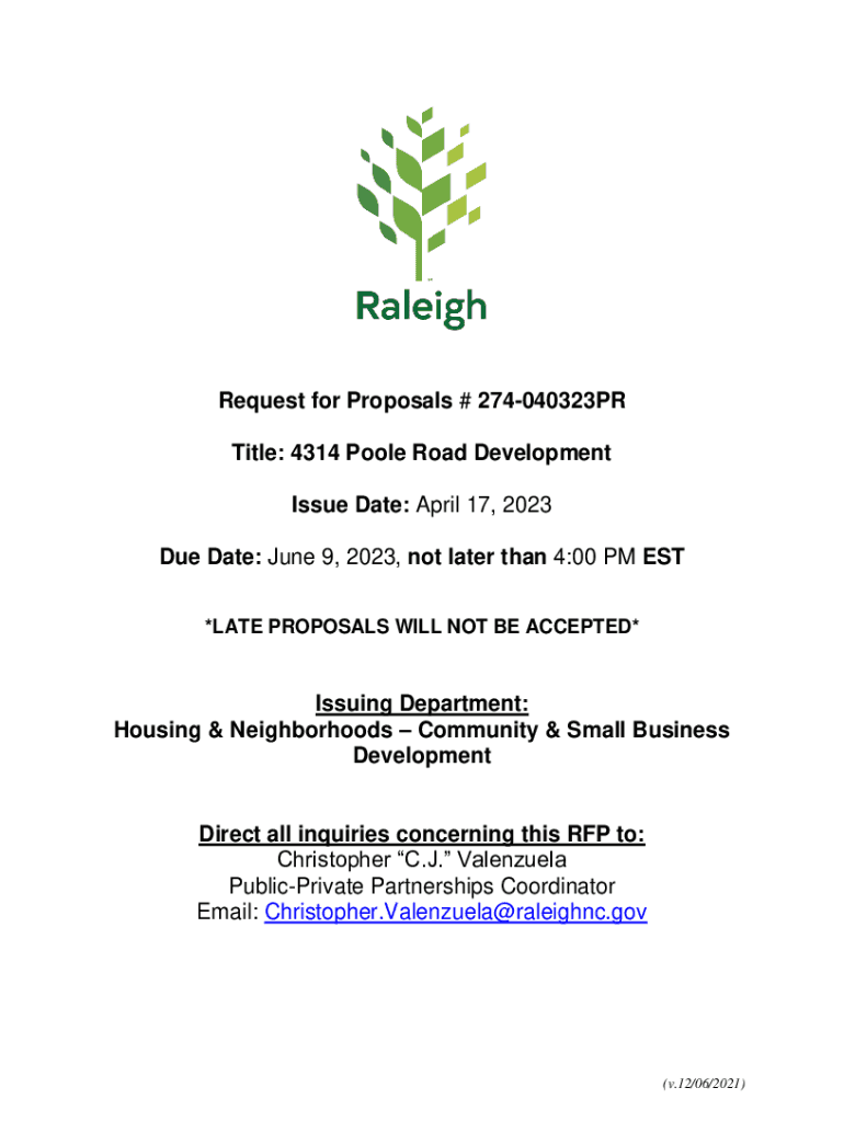 Request for Proposals # 274040323PR Title: 4314 Poole Road Development Issue Date: April 17, 2023, Due Date: June 9, 2023, not later than 4:00 PM EST *LATE PROPOSALS WILL NOT BE ACCEPTED×Issuing