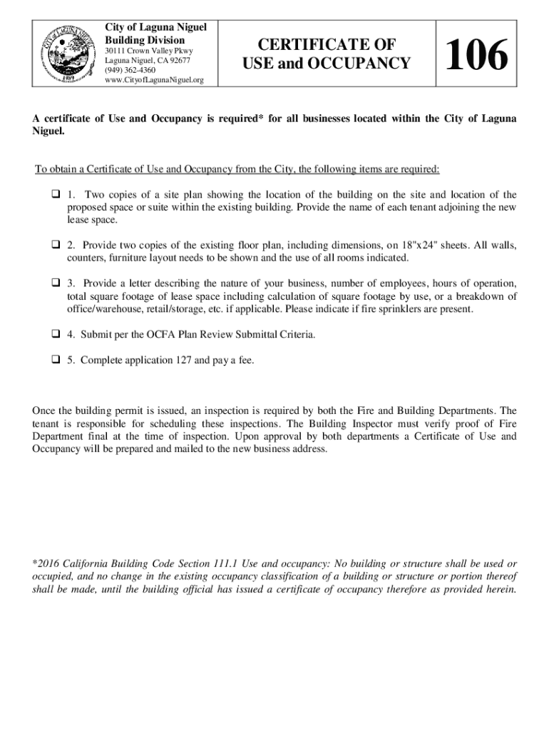 City of Laguna Niguel Building Division 30111 Crown Valley Pkwy Laguna Niguel, CA 92677 (949) 3624360 www.CityofLagunaNiguel.orgCERTIFICATE OF USE and OCCUPANCY106A certificate of Use and Occupancy