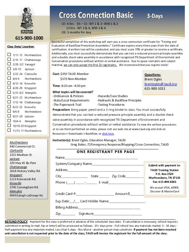 Cross Connection Basic3DaysCE: 6 hrs. DSC SWT 1 & 2WW 1 & 2 12 hrs. WT 3 & 4, WW 3 & 4 OE: 3 months for Any6159001000 Class Date/ Location: 1/1113 Murfreesboro 2/1517 Chattanooga 2/283/2 Farragut