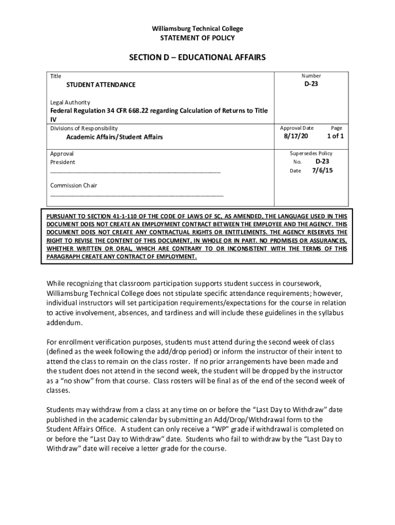 Williamsburg Technical CollegeSTATEMENT OF POLICYSECTION D EDUCATIONAL AFFAIRS NumberTitleSTUDENT ATTENDANCED23Legal Authority Federal Regulation 34 CFR 668.22 regarding Calculation of Returns to
