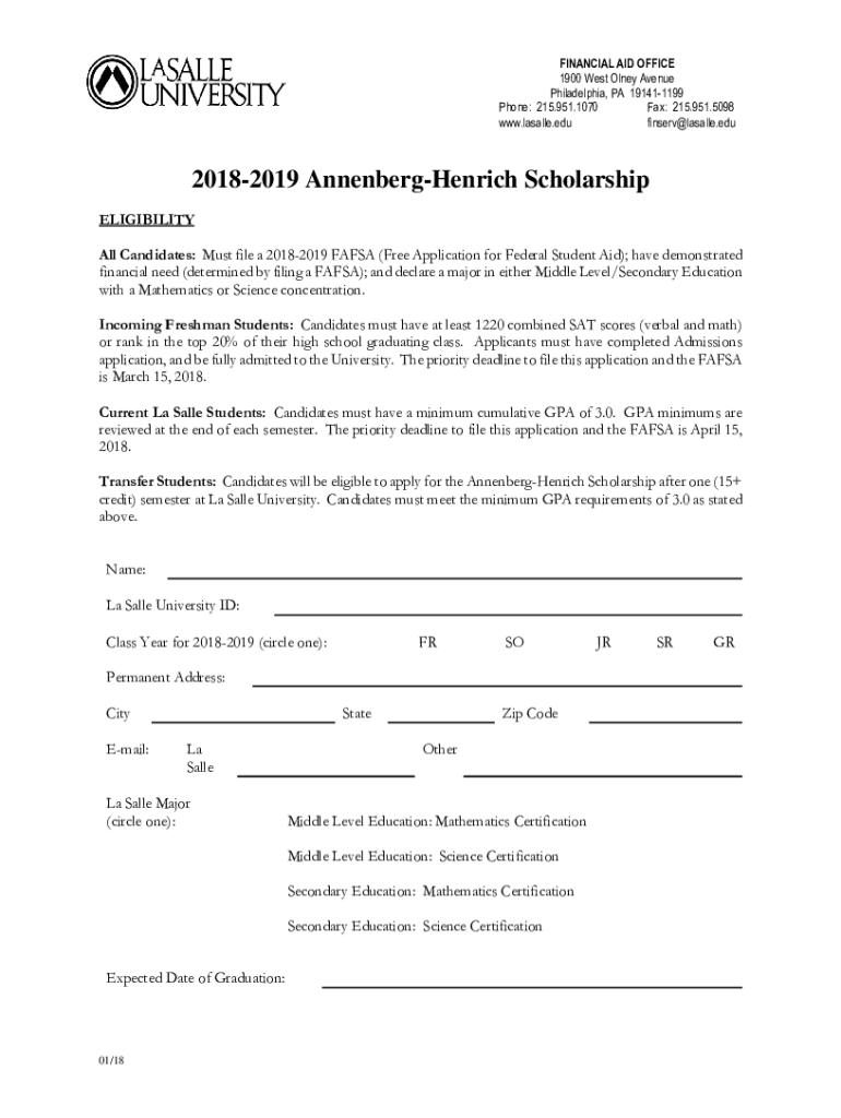 FINANCIAL AID OFFICE 1900 West Olney Avenue Philadelphia, PA 191411199 Phone: 215.951.1070 Fax: 215.951.5098 www.lasalle.edu finserv@lasalle.edu20182019 AnnenbergHenrich Scholarship ELIGIBILITY All