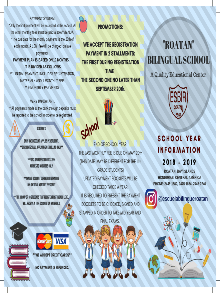 PAYMENT SYSTEM: *Only the first payment will be accepted at the school. All the other monthly fees must be paid at DAVIVIENDA. *The due date for the mostly payments is the 20th of each month. A 10%