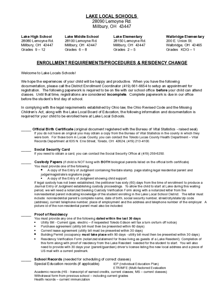LAKE LOCAL SCHOOLS 28090 Lemon Rd. Mill bury, OH 43447 Lake High School 28080 Lemon Rd. Mill bury, OH 43447 Grades 9 12Lake Middle School 28100 Lemon Rd. Mill bury, OH 43447 Grades 6 8Lake Elementary