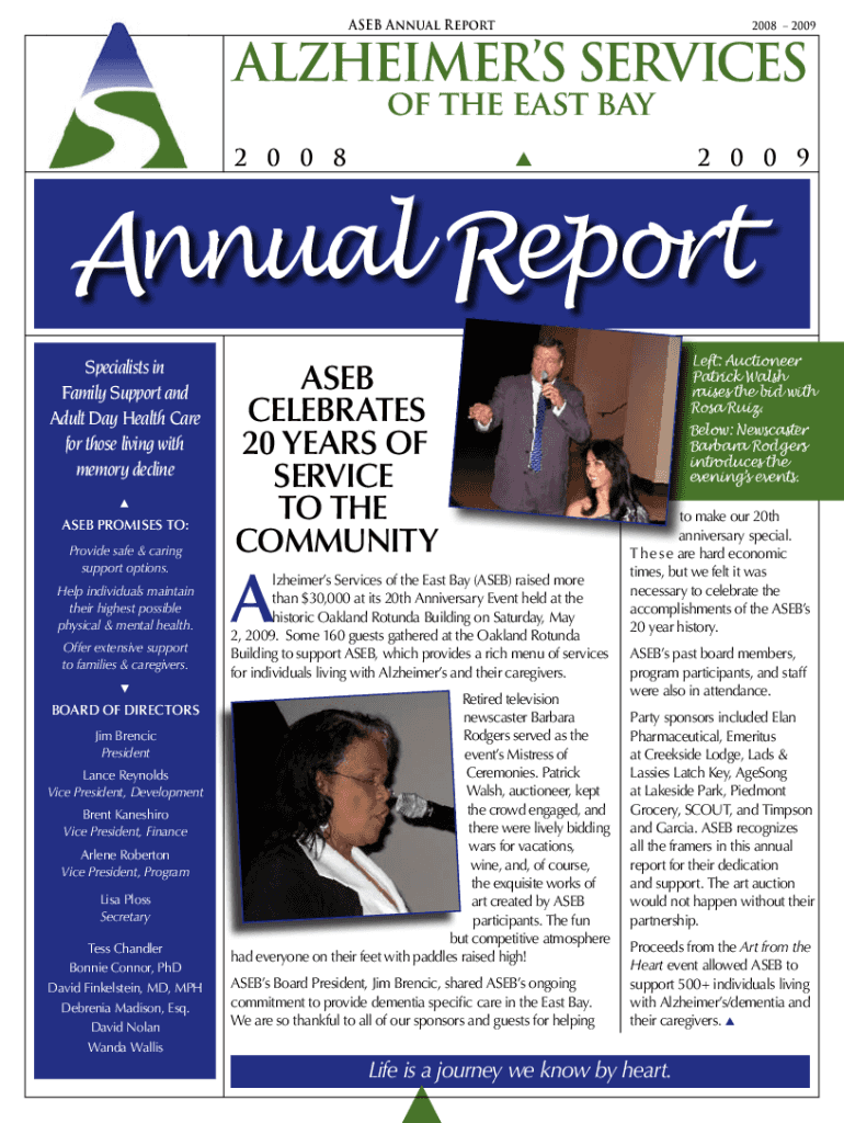ASB Annual Report2008 2009Alzheimers Services of the east bay2 0 0 82 0 0 9Annual Report Specialists in Family Support and Adult Day Health Care for those living with memory decline ASB PROMISES to: