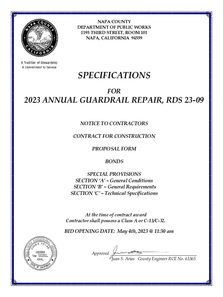 NAPA COUNTY DEPARTMENT OF PUBLIC WORKS 1195 THIRD STREET, ROOM 101 NAPA, CALIFORNIA 94559SPECIFICATIONS FOR2023 ANNUAL GUARDRAIL REPAIR, RDS 2309 NOTICE TO CONTRACTORS CONTRACT FOR CONSTRUCTION PROPOSAL