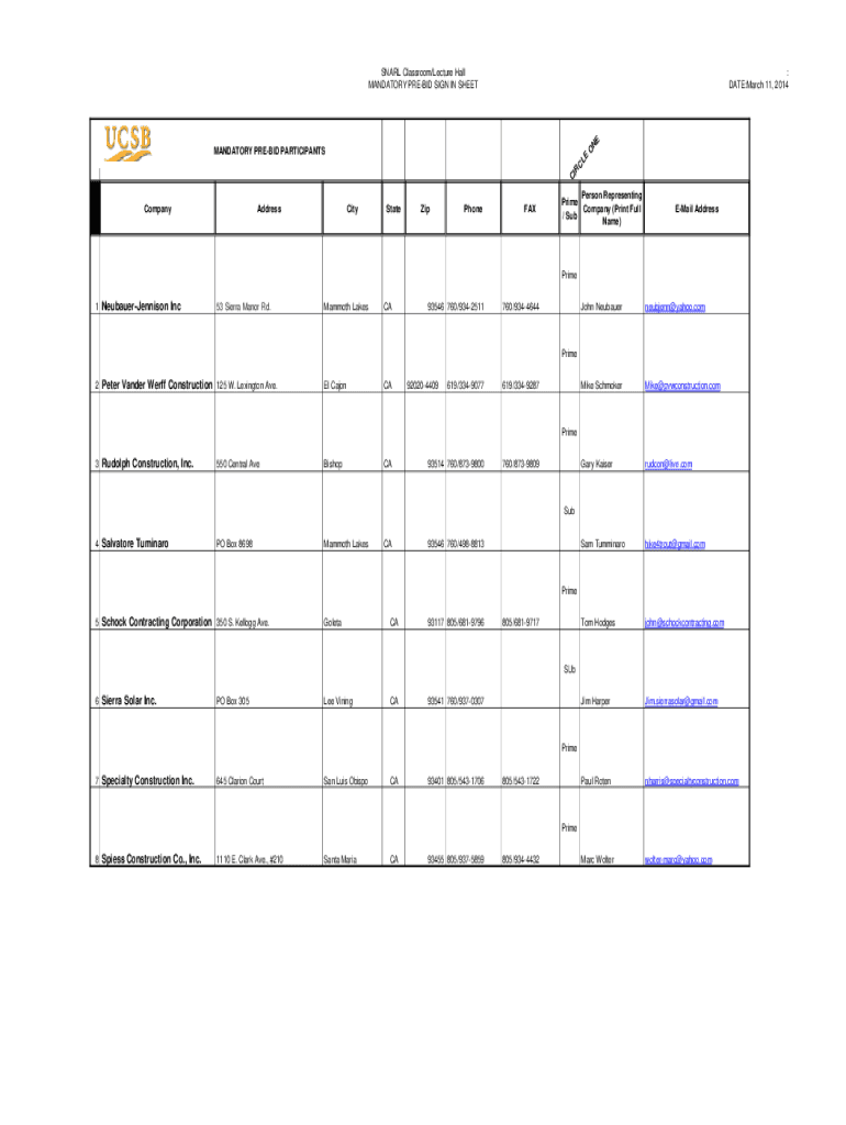SNARL Classroom/Lecture Hall MANDATORY PREBID SIGN IN SHEET: DATE:March 11, 2014MANDATORY PREBID PARTICIPANTS R IN o. CompanyAddressCityStateZipPhoneFAXE Nonperson Representing Prime Company (Print