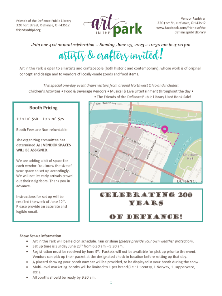 Friends of the Defiance Public Library 320 Fort Street, Defiance, OH 43512 friendsofdpl. Vendor Registrar 320 Fort St., Defiance, OH 43512 www.facebook.com/friendsofthe defiancepubliclibraryJoin our