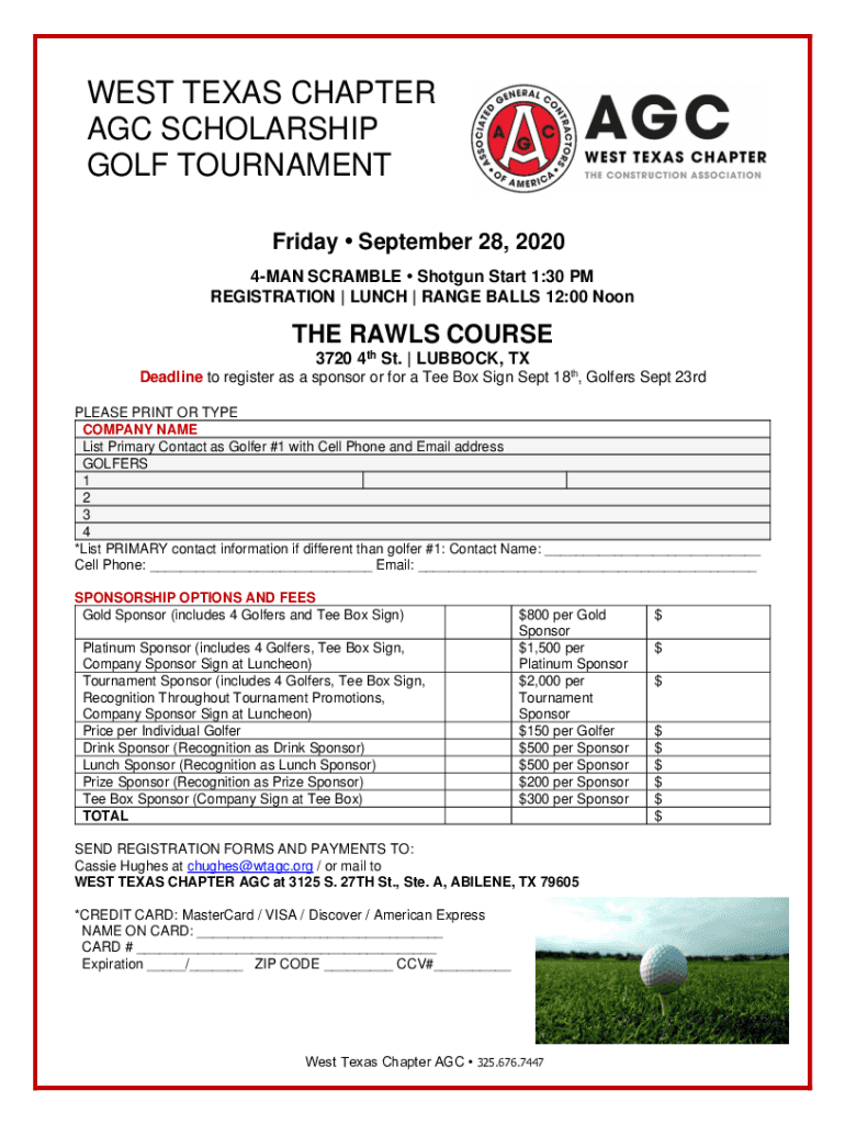 WEST TEXAS CHAPTER AGC SCHOLARSHIP GOLF TOURNAMENT Friday, September 28, 2020 4MAN SCRAMBLE Shotgun Start 1:30 PM REGISTRATION | LUNCH | RANGE BALLS 12:00 Soothe RAILS COURSE 3720 4th St. | LUBBOCK,