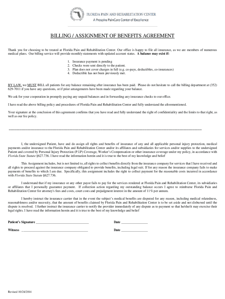 BILLING / ASSIGNMENT OF BENEFITS AGREEMENT Thank you for choosing to be treated at Florida Pain and Rehabilitation Center. Our office is happy to file all insurance, as we are members of numerous
