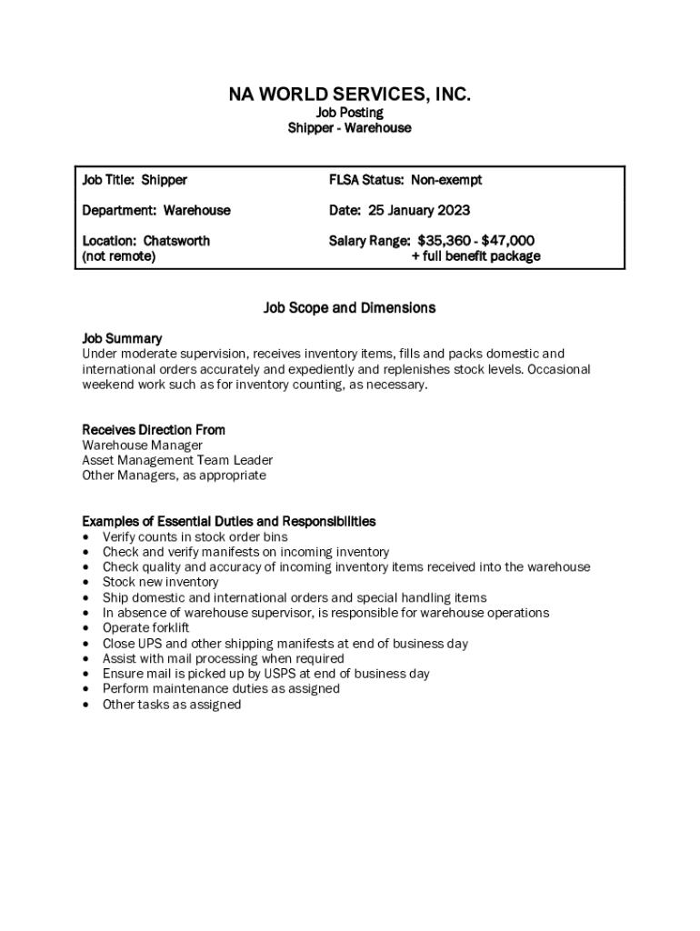 Shipper Warehouse Job Title: Shippers Status: NonexemptDepartment: Warehouse Date: 25 January 2023Location: Chats worth