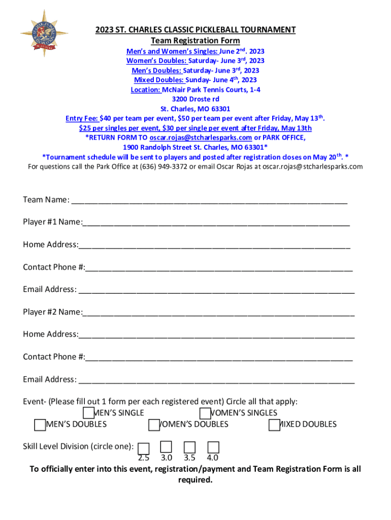 2023 ST. CHARLES CLASSIC PICKLEBALL TOURNAMENT Team Registration Foramens and Women's Singles: June 2nd. 2023 Women's Doubles: Saturday, June 3rd, 2023 Men Doubles: Saturday, June 3rd, 2023 Mixed