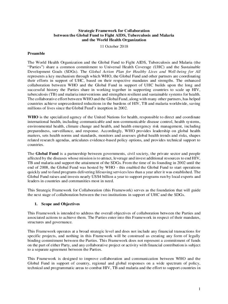 Strategic Framework for Collaboration between the Global Fund to Fight AIDS, Tuberculosis and Malaria and the World Health Organization 11 October 2018 Preamble The World Health Organization and the