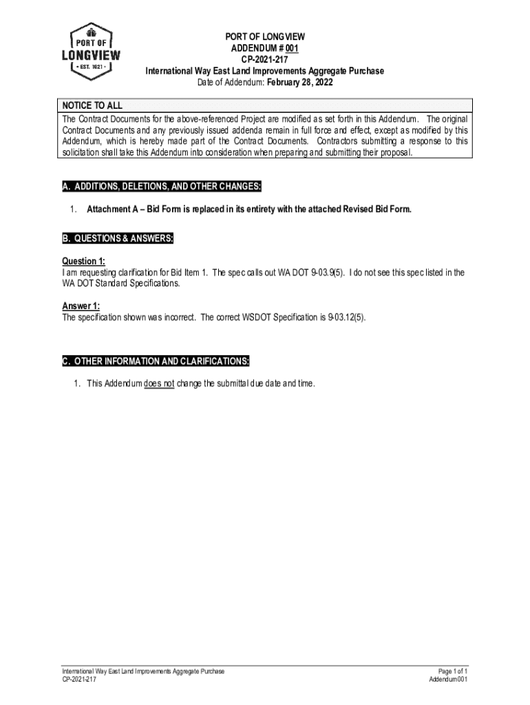 PORT OF LONGVIEW ADDENDUM # 001 CP2021217 International Way East Land Improvements Aggregate Purchase Date of Addendum: February 28, 2022, NOTICE TO ALL The Contract Documents for the above referenced