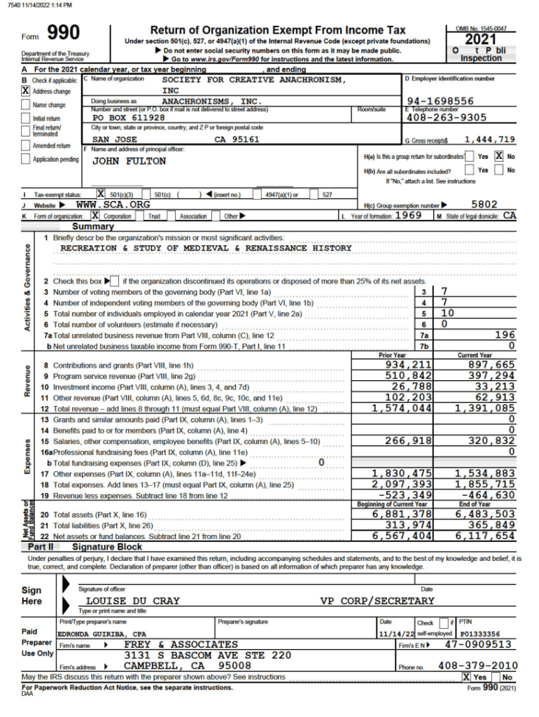 7540 11/14/2022 1:14 Form 990 (2021)Part III 1SOCIETY FOR CREATIVE ANACHRONISM, 941698556Statement of Program Service Accomplishments Check if Schedule O contains a response or note to any line in