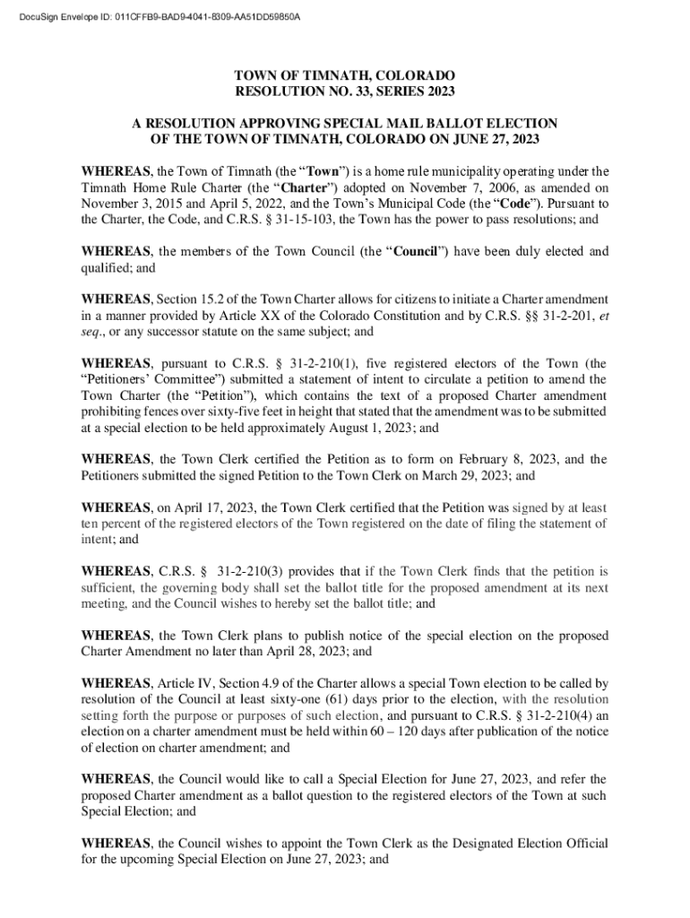 DocuSign Envelope ID: 011CFFB9BAD940418309AA51DD59850ATOWN OF NINTH, COLORADO RESOLUTION NO. 33, SERIES 2023 A RESOLUTION APPROVING SPECIAL MAIL BALLOT ELECTION OF THE TOWN OF NINTH, COLORADO ON JUNE