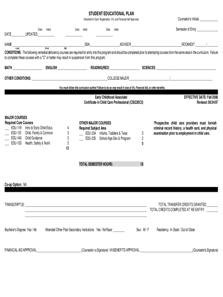 STUDENT EDUCATIONAL PLAN Counselor\'s Initials ___(Needed for Each Registration, VA, and Financial Aid Approval) DateInitialDATE___UPDATED___DateInitial___DateSemester of Entry ___Initial___NAME ___
