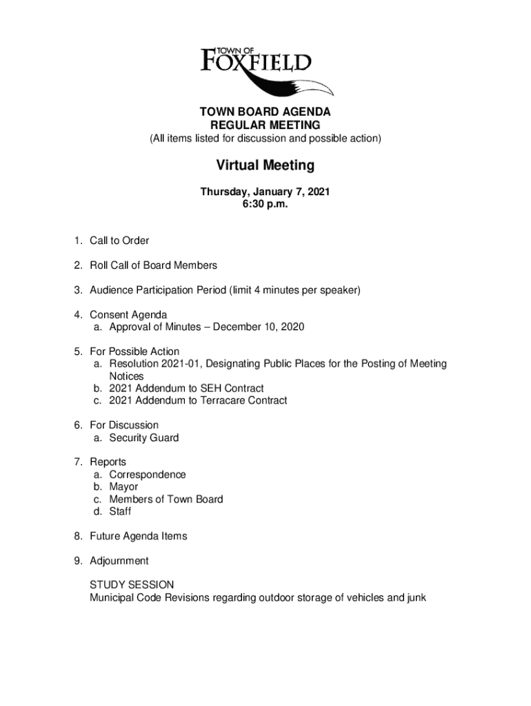TOWN BOARD AGENDA REGULAR MEETING (All items listed for discussion and possible action)Virtual Meeting Thursday, January 7, 2021 6:30 p.m.1. Call to Order 2. Roll Call of Board Members 3. Audience