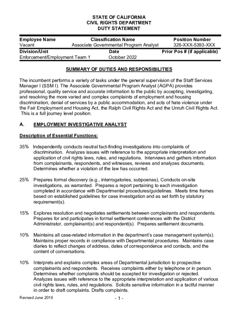 STATE OF CALIFORNIA CIVIL RIGHTS DEPARTMENT DUTY STATEMENT Employee Name Classification Name Position Number Vacant Associate Governmental Program Analyst 326XXX5393XXX Division/Unit Date Prior Po's