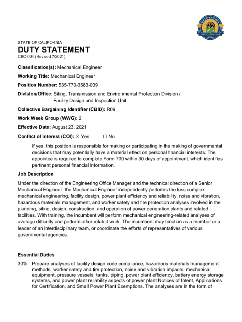 STATE OF CALIFORNIADUTY STATEMENT CEC004 (Revised 7/2021)Classification(s): Mechanical Engineer Working Title: Mechanical Engineer Position Number: 5357703583009 Division/Office: Siting, Transmission