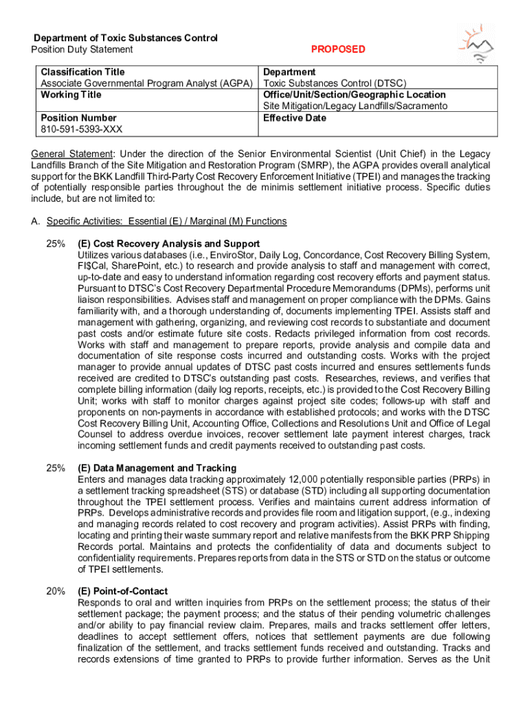Department of Toxic Substances Control Position Duty Statement Classification Title Associate Governmental Program Analyst (APA) Working Title Position Number 8105915393XXXPROPOSED Department Toxic