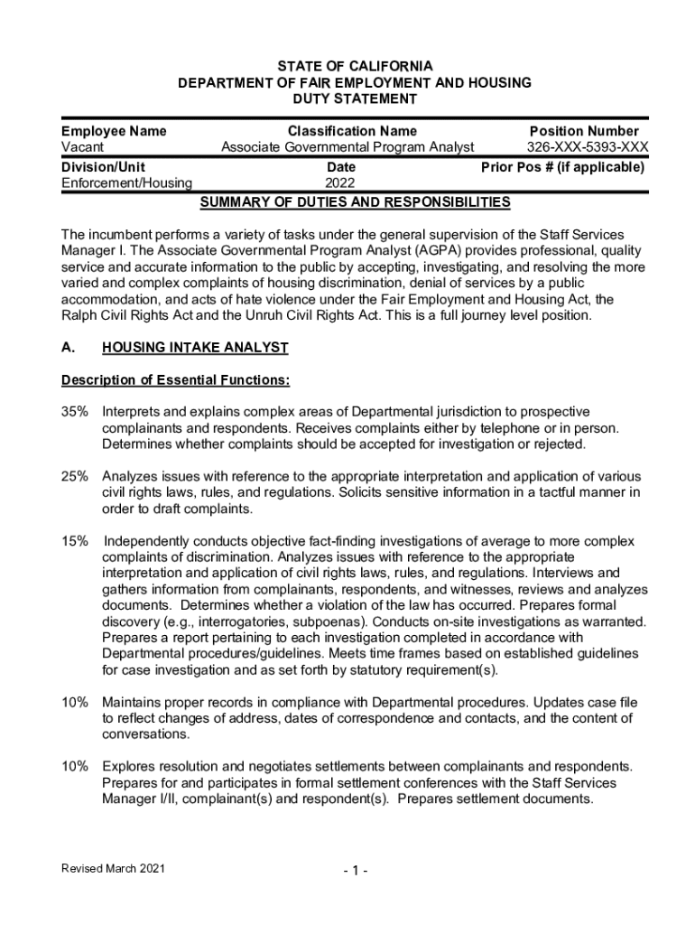 STATE OF CALIFORNIA DEPARTMENT OF FAIR EMPLOYMENT AND HOUSING DUTY STATEMENT Employee Name Vacant Division/Unit Enforcement/HousingClassification Name Position Number Associate Governmental Program
