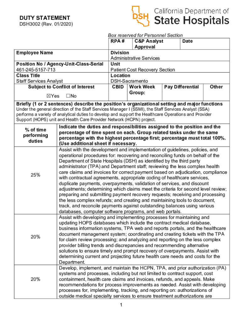 DUTY STATEMENTDSH3002 (Rev. 01/2020) Box reserved for Personnel Section RPA # C&P Analyst Date Approval Employee Name Division Administrative Services Position No / AgencyUnitClassSerial Unit 4612455157713