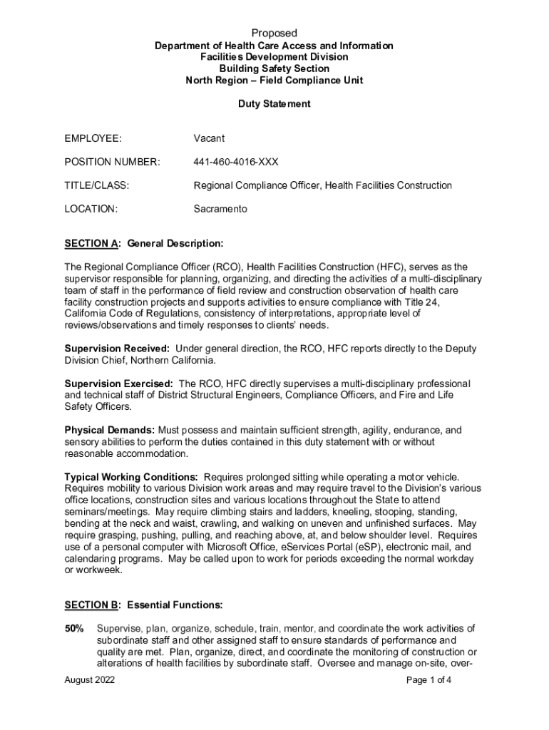 Proposed Department of Health Care Access and Information Facilities Development Division Building Safety Section North Region Field Compliance Unit Duty Statement EMPLOYEE:VacantPOSITION NUMBER:4414604016XXXTITLE/CLASS:Regional
