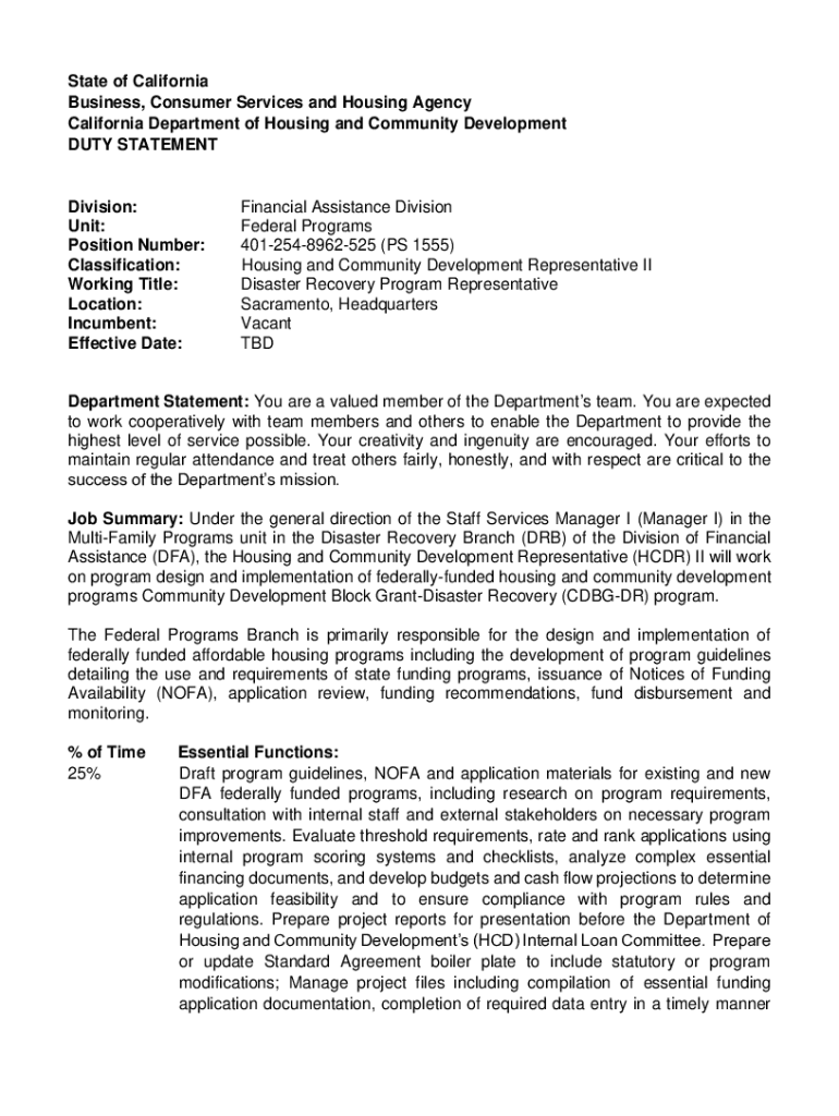 State of California Business, Consumer Services and Housing Agency California Department of Housing and Community Development DUTY STATEMENTDivision: Unit: Position Number: Classification: Working