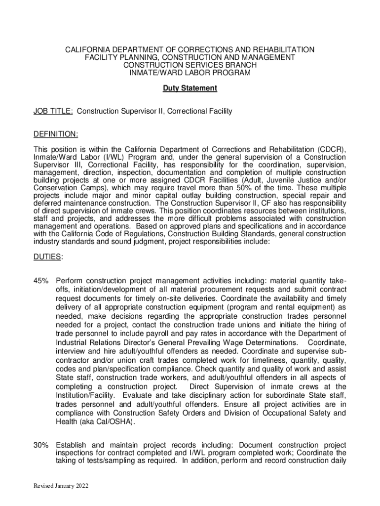 CALIFORNIA DEPARTMENT OF CORRECTIONS AND REHABILITATION FACILITY PLANNING, CONSTRUCTION AND MANAGEMENT CONSTRUCTION SERVICES BRANCH INMATE/WARD LABOR PROGRAM Duty Statement JOB TITLE: Construction