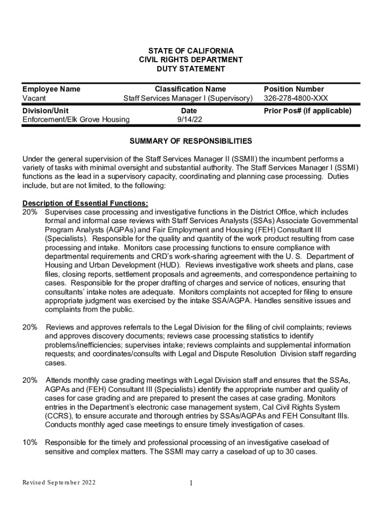 STATE OF CALIFORNIA CIVIL RIGHTS DEPARTMENT DUTY STATEMENT Employee Name VacantClassification Name Staff Services Manager I (Supervisory)Division/Unit Enforcement/Elk Grove HousingDate 9/14/22Position
