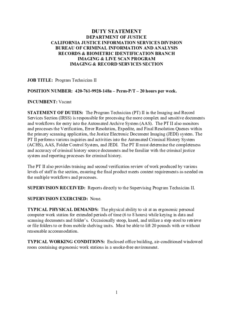 DUTY STATEMENTDEPARTMENT OF JUSTICE CALIFORNIA JUSTICE INFORMATION SERVICES DIVISION BUREAU OF CRIMINAL INFORMATION AND ANALYSIS RECORDS & BIOMETRIC IDENTIFICATION BRANCH IMAGING & LIVE SCAN PROGRAM