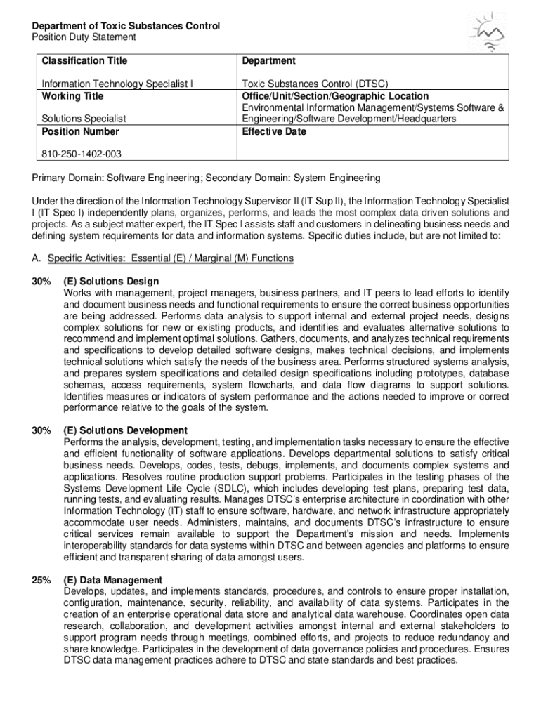 Department of Toxic Substances Control Position Duty Statement Classification TitleDepartmentInformation Technology Specialist I'm Working TitleToxic Substances Control (DISC) Office/Unit/Section/Geographic