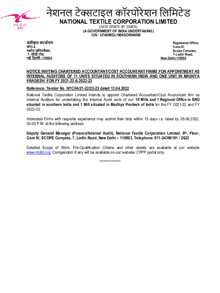 NATIONAL TEXTILE CORPORATION LIMITED () (A GOVERNMENT OF INDIA UNDERTAKING) IN : U74899DL1968GOI004866 4, 7, 110003Registered Office, Core IV, Scope Complex, 7Lodhi Road, New Delhi110003NOTICE