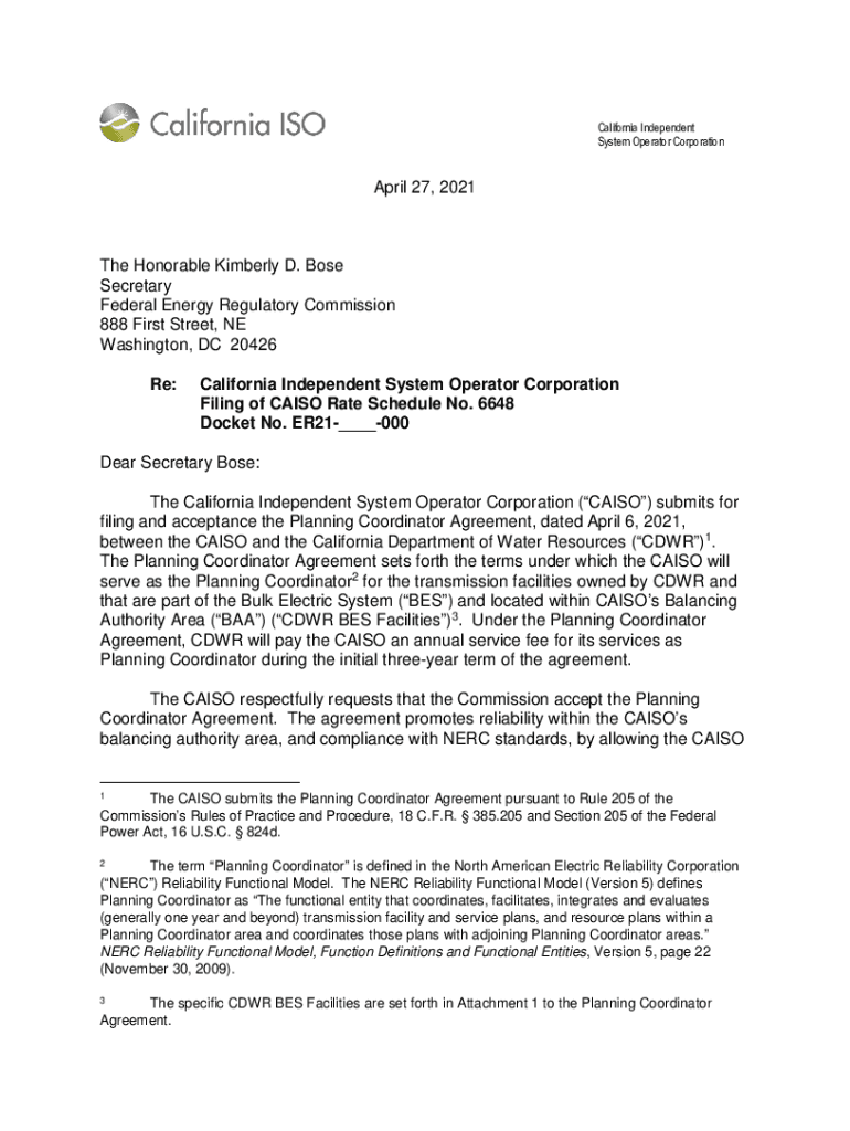 California Independent System Operator Corporation April 27, 2021The Honorable Kimberly D. Bose Secretary Federal Energy Regulatory Commission 888 First Street, NE Washington, DC 20426 Re:California