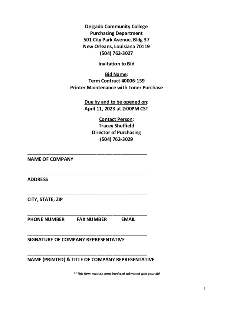 Delgado Community College Purchasing Department 501 City Park Avenue, Bldg 37 New Orleans, Louisiana 70119 (504) 7623027 Invitation to Bid Name: Term Contract 40006159 Printer Maintenance with Toner