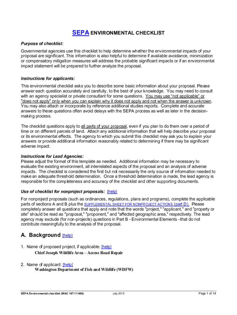 SEPA ENVIRONMENTAL CHECKLIST Purpose of checklist: Governmental agencies use this checklist to help determine whether the environmental impacts of your proposal are significant. This information is