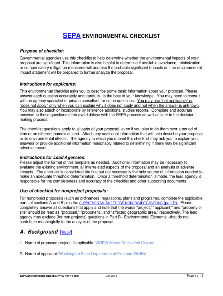 SEPA ENVIRONMENTAL CHECKLIST Purpose of checklist: Governmental agencies use this checklist to help determine whether the environmental impacts of your proposal are significant. This information is