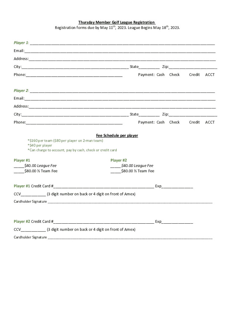 Thursday Member Golf League Registration forms due by May 11th, 2023. League Begins May 18th, 2023. Player 1: ___ Email:___ Address:___ City:___ State___ Zip:___ Phone:___Payment: CashCheckCreditACCTPlayer