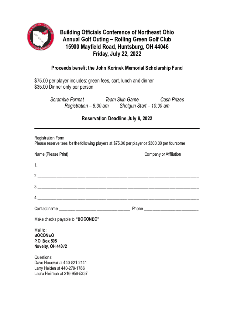 Building Officials Conference of Northeast Ohio Annual Golf Outing Rolling Green Golf Club 15900 Mayfield Road, Hunts burg, OH 44046 Friday, July 22, 2022, Proceeds benefit the John Corine Memorial