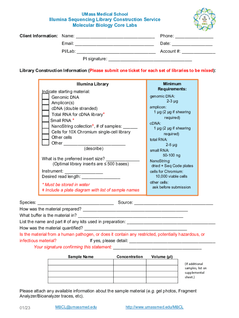 Mass Medical SchoolIllumina Sequencing Library Construction Service Molecular Biology Core Labs Client Information: Name: ___Phone: ___Email: ___Date: ___PI/Lab: ___Account #: ___PI signature: ___