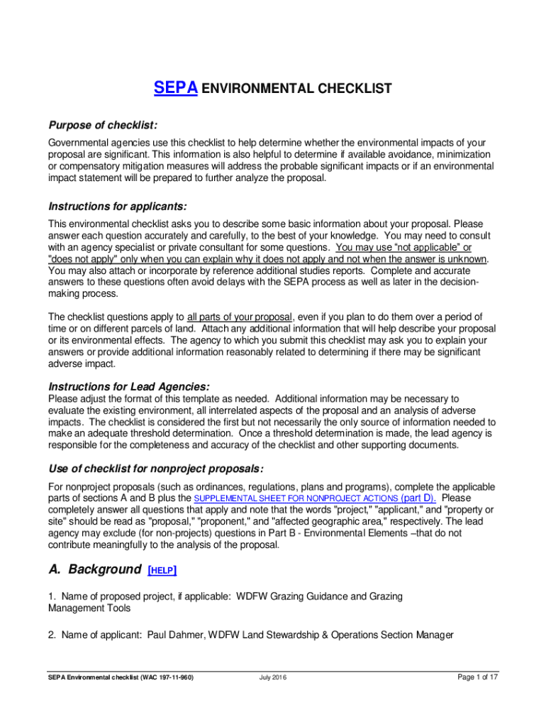 SEPA ENVIRONMENTAL CHECKLIST Purpose of checklist: Governmental agencies use this checklist to help determine whether the environmental impacts of your proposal are significant. This information is