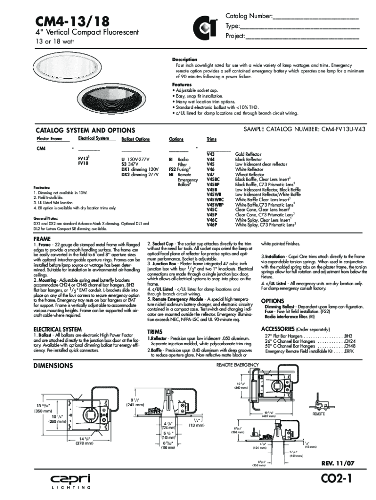 Catalog Number:___CM413/18Type:___4\” Vertical Compact FluorescentProject:___13 or 18 wattDescription Four inch downright rated for use with a wide variety of lamp wattage and trims. Emergency remote