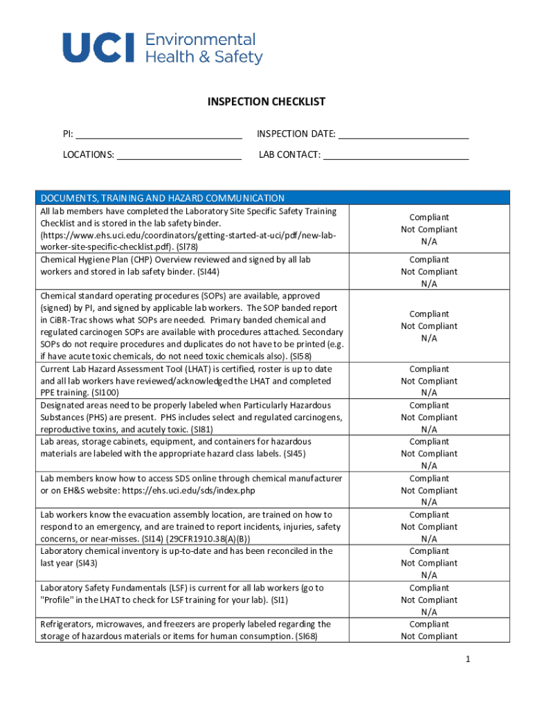 Get the free Lab Inspections - Environmental Health & Safety - ehs uci