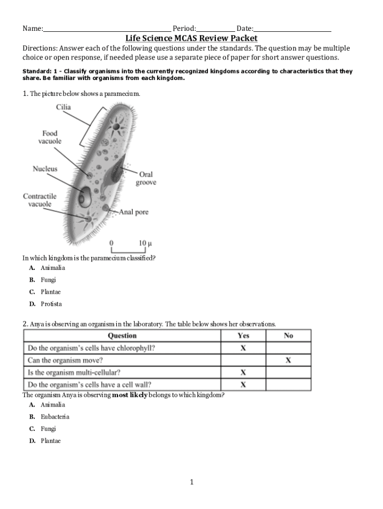 Name:___Period:___Date:___ LifeScienceMCASReviewPacket Directions:Answereachofthefollowingquestionsunderthestandards. Thequestionmaybemultiple choiceoropenresponse, ifneededpleaseuseaseparatepieceofpaperforshortanswerquestions.